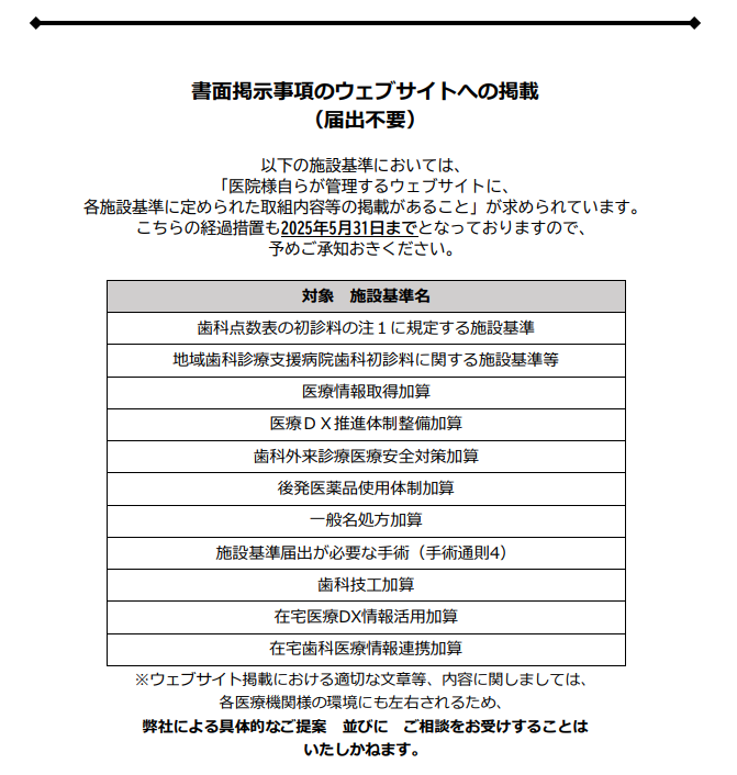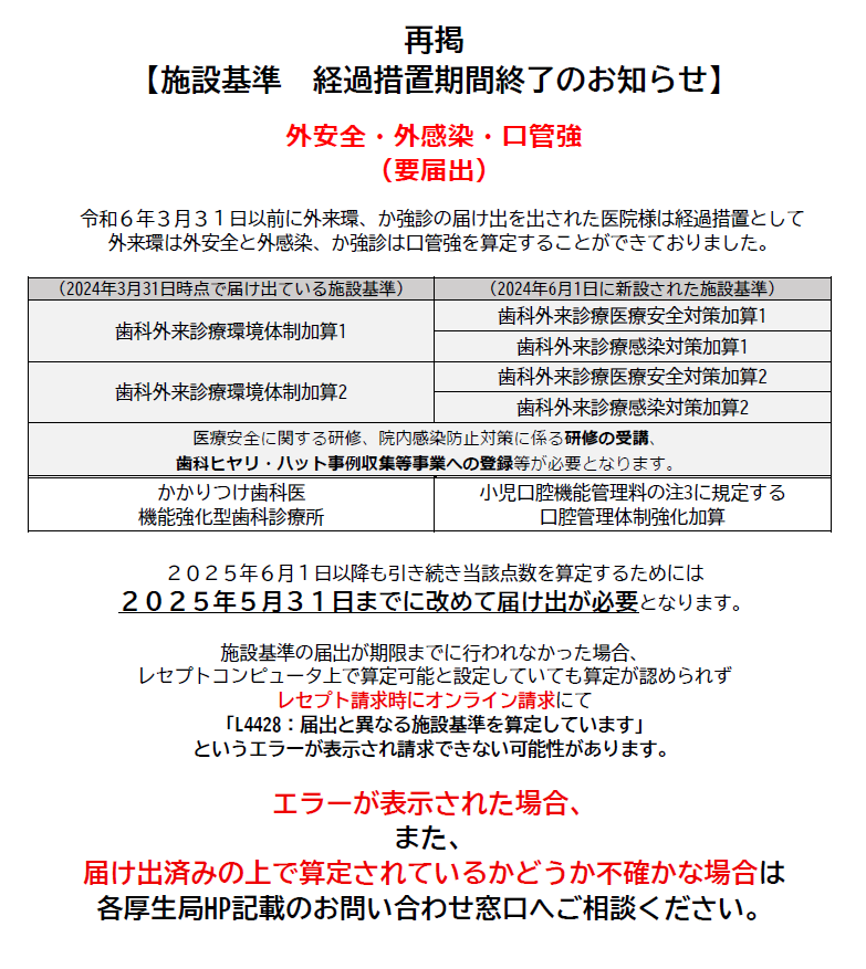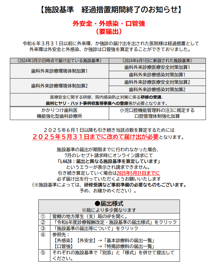 R5/3/14【施設基準の経過措置のお知らせ】施設基準の経過措置がR5年3月31日で終了します。